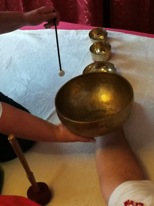 Klangschalen werden auf den bekleideten Körper aufgelegt und sanft angeschlagen. Die rhythmischen Schwingungen übertragen sich auf die Körperzellen und führen zu